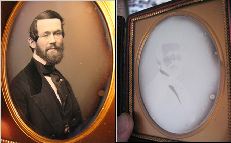 The final image made in a daguerreotype was a very fragile direct positive image, easily smudged by an errant finger. It had a surface finish like a mirror, requiring the plate to be angled so as to permit viewing of the image. The highlights are created by greater amounts of silver amalgam particles on the plate surface, scattering the light into your eyes. The shadows of the image are created by few or no silver amalgam particle deposits, allowing the polished silver finish to reflect all light away from your eye, thus appearing dark. The viewer’s own reflection can be seen in the image at times, and depending on the angle of viewing and the ambient lighting, the image could switch from a positive to a negative.